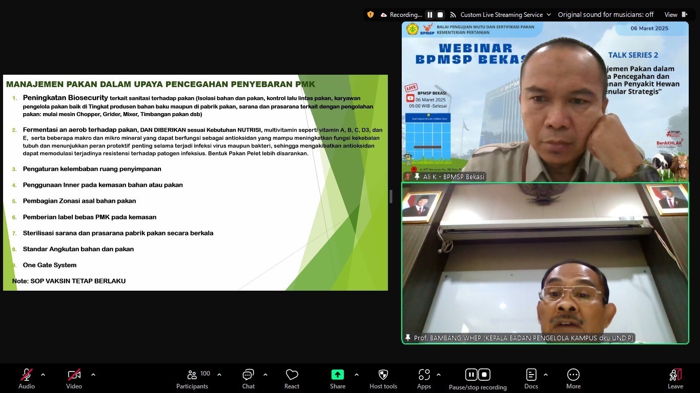 Webinar yang diikuti 865 peserta ini mendapat respons positif, menunjukkan tingginya kepedulian pelaku industri peternakan terhadap ancaman PHMS. Kepala BPMSP Bekasi, Dayat, mengapresiasi antusiasme tersebut dan menegaskan perlunya kolaborasi lintas sektor dalam memastikan pakan yang aman dan berkualitas.