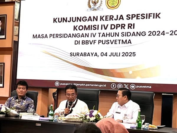 Surabaya — Kementerian Pertanian mendorong peningkatan kemampuan produksi vaksin Penyakit Mulut dan Kuku (PMK) di Balai Besar Veteriner Farma (Pusvetma) Surabaya guna memperkuat kemandirian bangsa dalam pengendalian penyakit hewan. Dukungan terhadap penguatan peran Pusvetma ini menjadi salah satu poin utama dalam kunjungan kerja spesifik Komisi IV DPR RI, Jumat (4/7/2025).