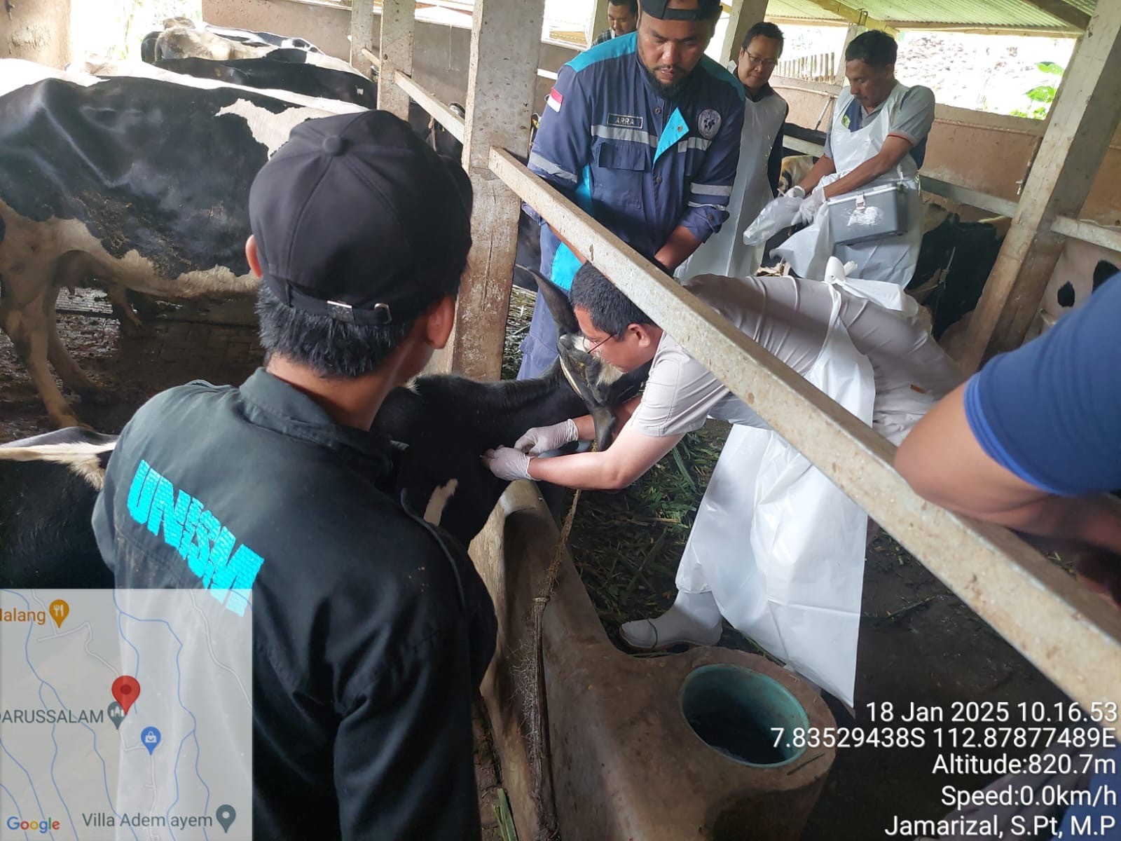 Direktur Pengolahan dan Pemasaran Hasil Peternakan (PPHNAK), Makmun, bersama Kepala Balai Besar Veteriner Farma Pusvetma, Edi Budi Susila, Kepala Balai Besar Inseminasi Buatan (BBIB) Singosari, Akbar, dan Kepala Bidang Kesehatan Hewan Dinas Peternakan dan Kesehatan Hewan Kabupaten Pasuruan, Panti Absari, terjun dari kandang ke kandang sapi milik peternak.