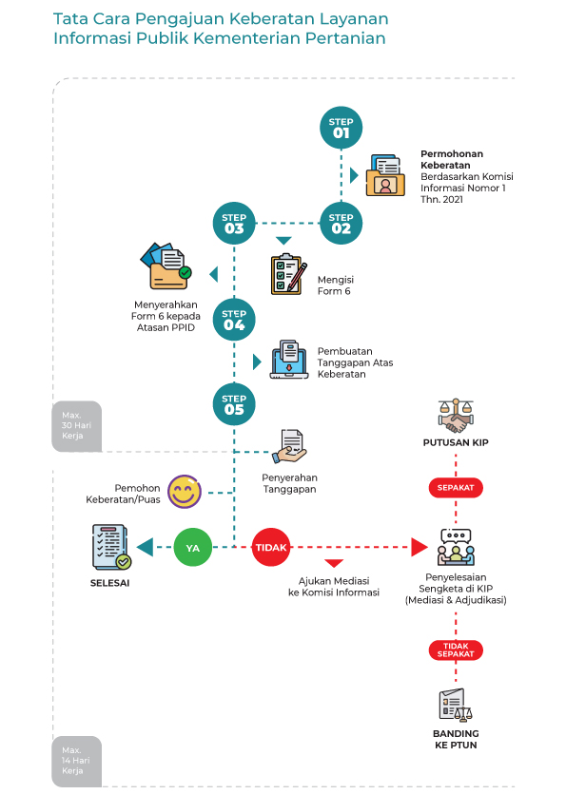 Keberatan informasi diajukan oleh Pemohon Informasi Publik apabila pemohon merasa tidak puas atas jawaban yang diberikan PPID. Pemohon mengajukan keberatan kepada Atasan PPID melalui formular keberatan yang dapat diakses di Portal PPID. Berdasarkan Pasal 39 Peraturan Komisi Informasi Nomor 1 Tahun 2021 tentang Sandar Layanan Informasi Publik menyatakan: