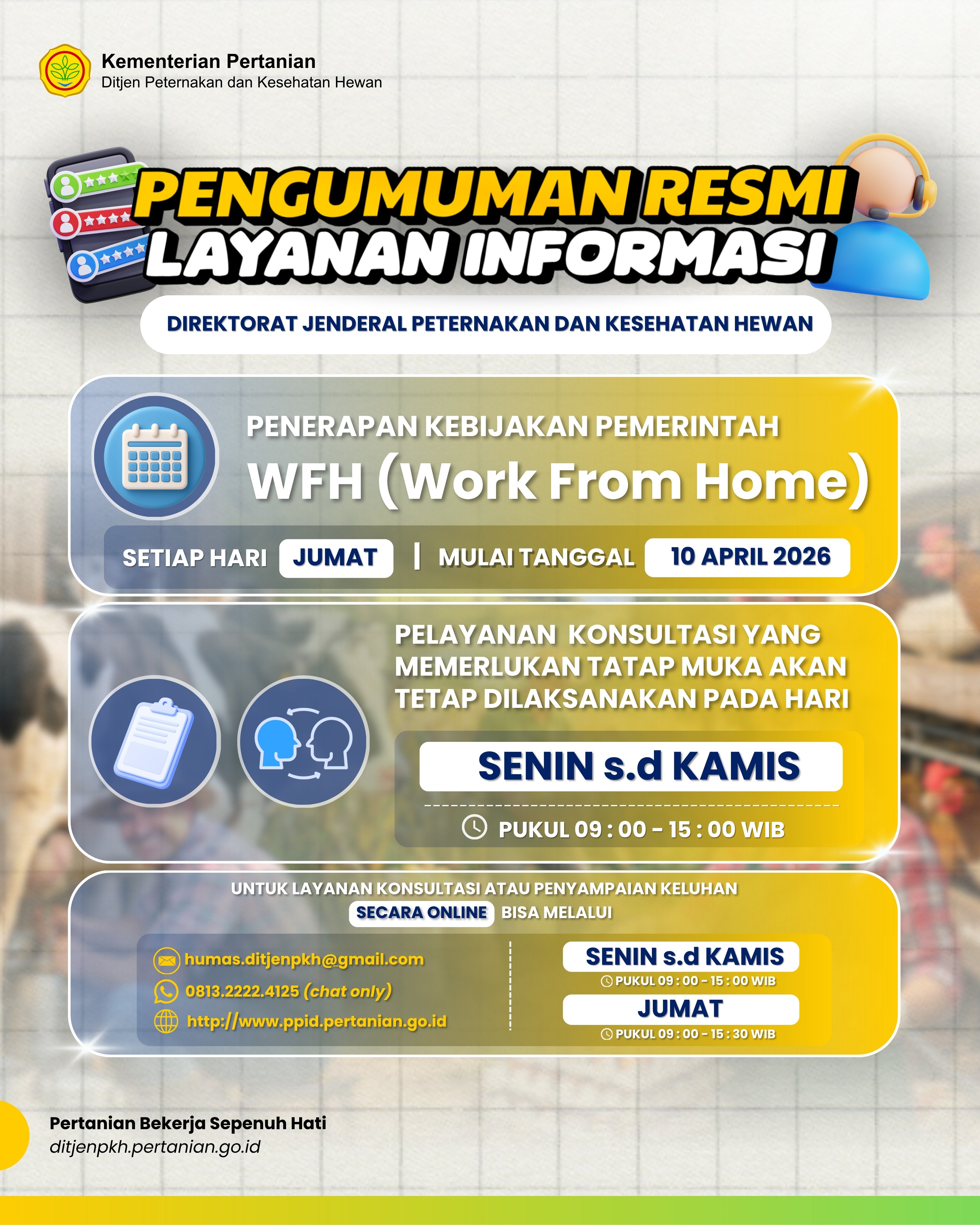 #SobatTernak, dalam rangka penerapan kebijakan pemerintah, layanan di lingkungan Direktorat Jenderal Peternakan dan Kesehatan Hewan menyesuaikan dengan sistem Work From Home (WFH).