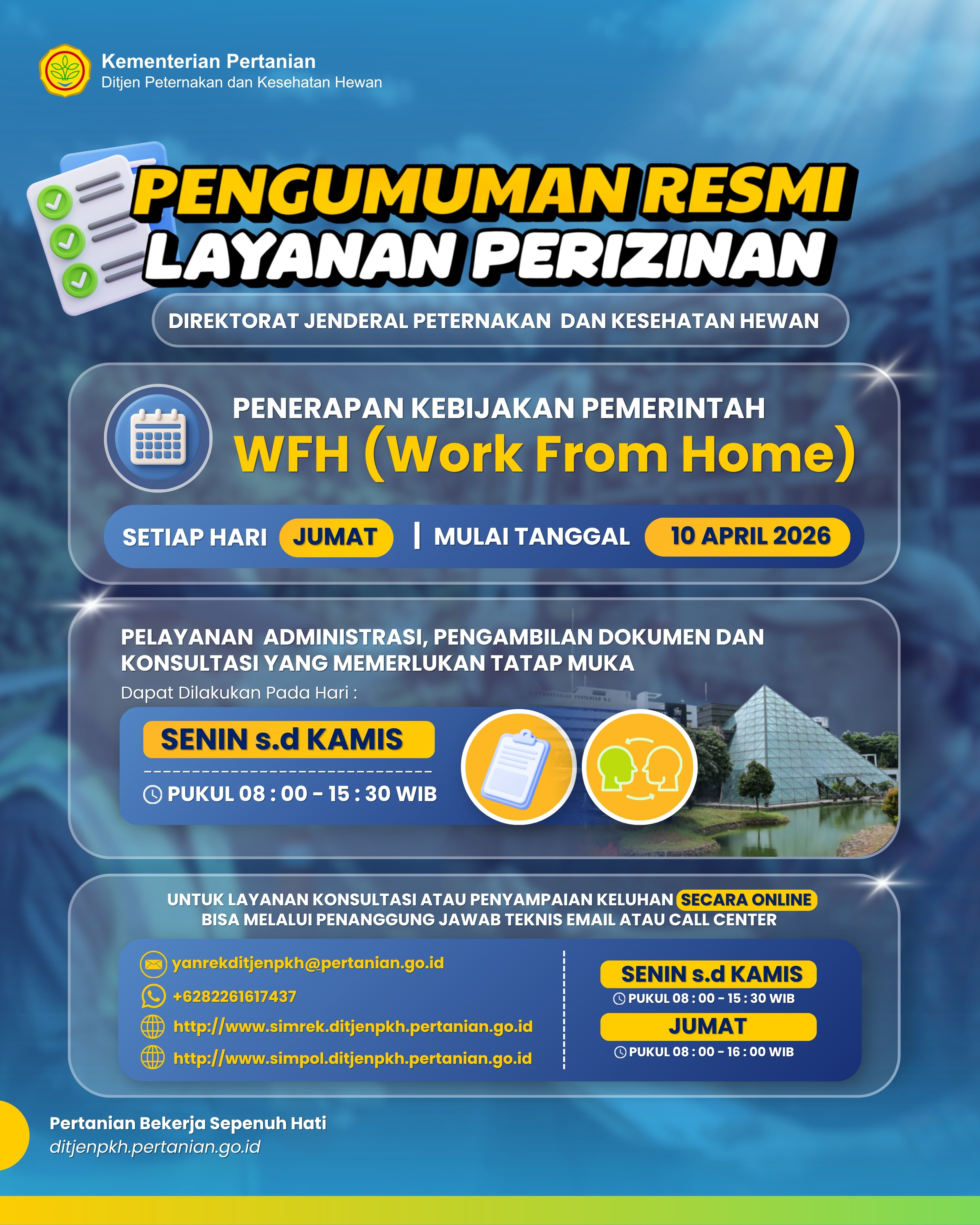 #SobatTernak, dalam rangka penerapan kebijakan pemerintah, layanan di lingkungan Direktorat Jenderal Peternakan dan Kesehatan Hewan menyesuaikan dengan sistem Work From Home (WFH).